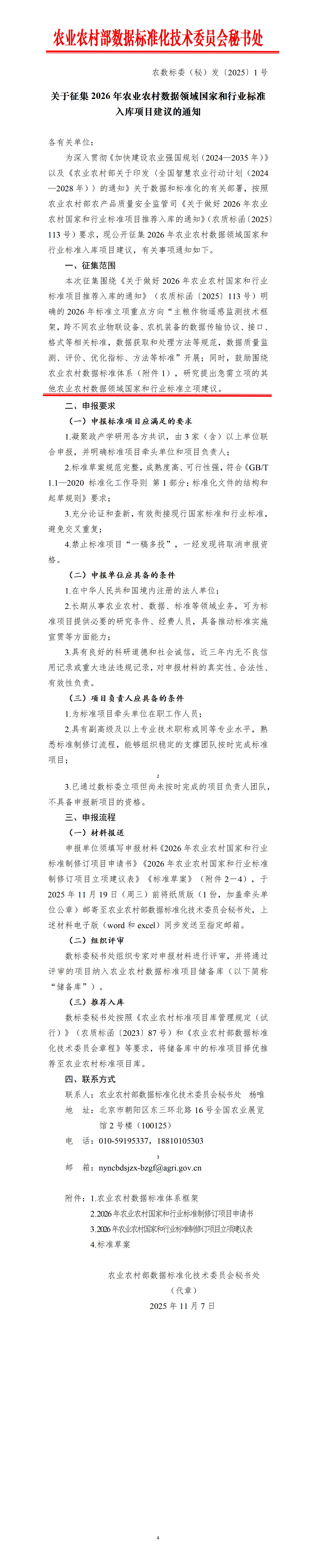 關于征集2026年農業農村數據領域國家和行業標準入庫項目建議的通知